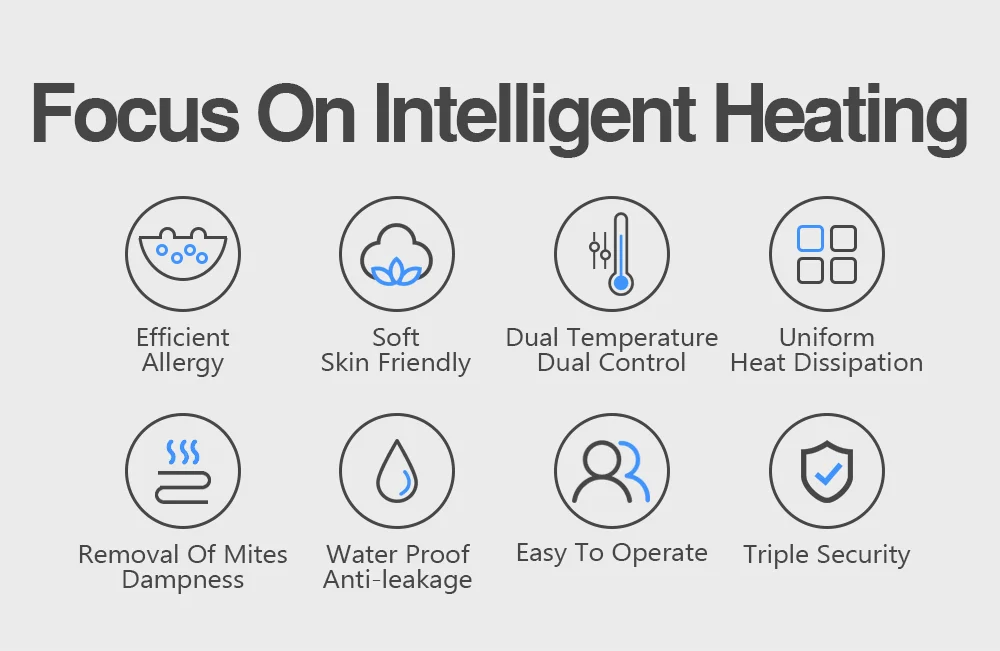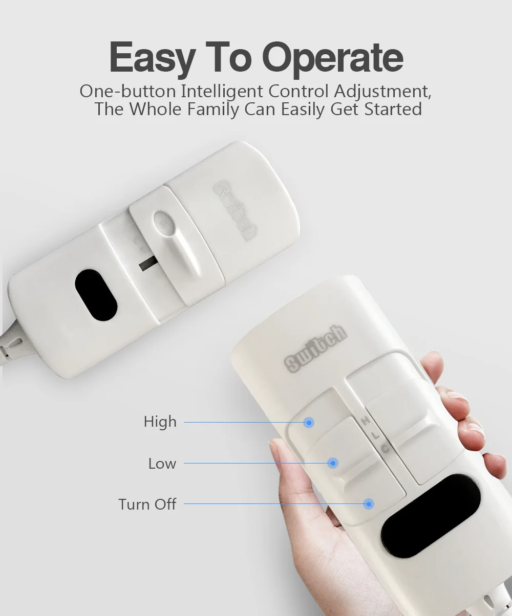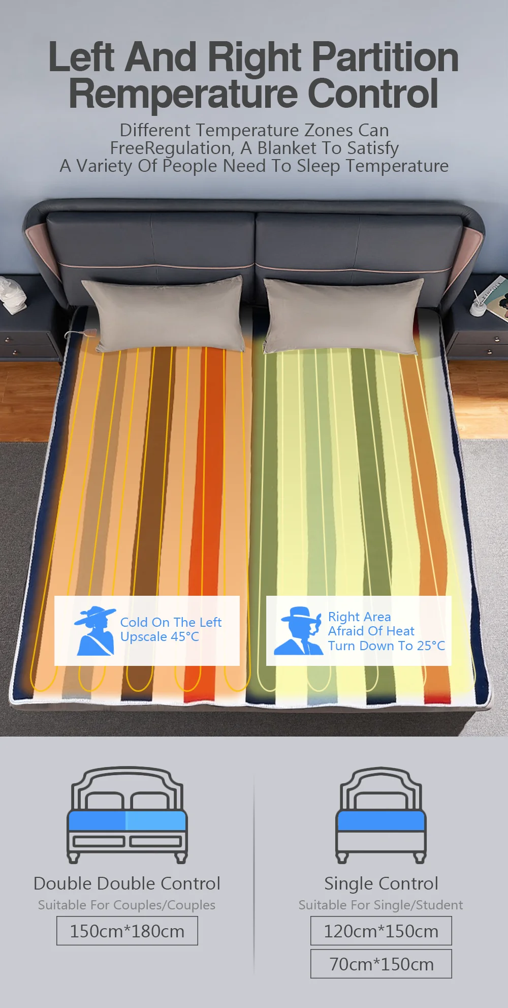 1.Dual Controller(150*180cm), There are 3 gears, high temperature, low temperature and switch,Can control the temperature of the left and right sides separately.